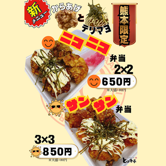 博多とよ唐亭の代名詞であるげんこつからあげ弁当、チキンてりマヨ弁当の他、熊本エリア限定の2つのメニューを掛け合わせた「ニコニコ」「サンサン」弁当